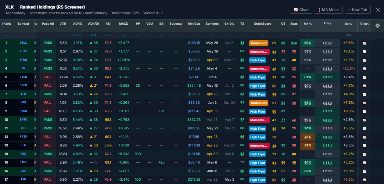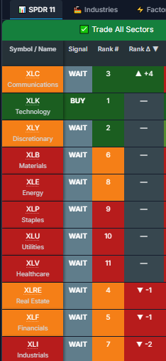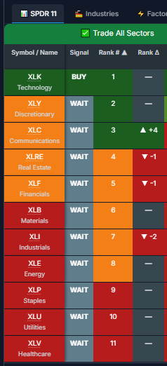 - Sector board shows XLK in top 3, and XLC moving up fastest.