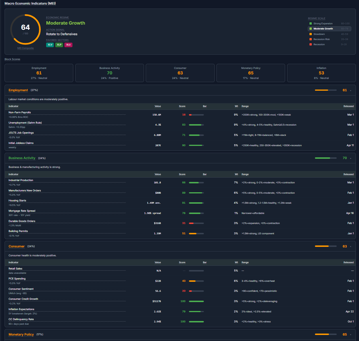 Macro Economic Indicator (MEI) — a composite score blending leading economic data (yield curve, PMI, credit spreads, inflation trends) into a single regime reading. A rising MEI favours growth sectors; a falling MEI shifts the edge to defensives.