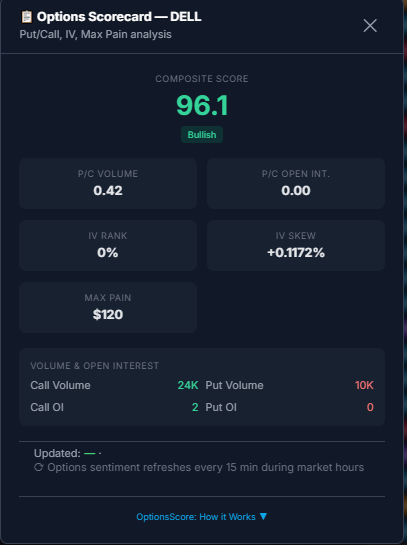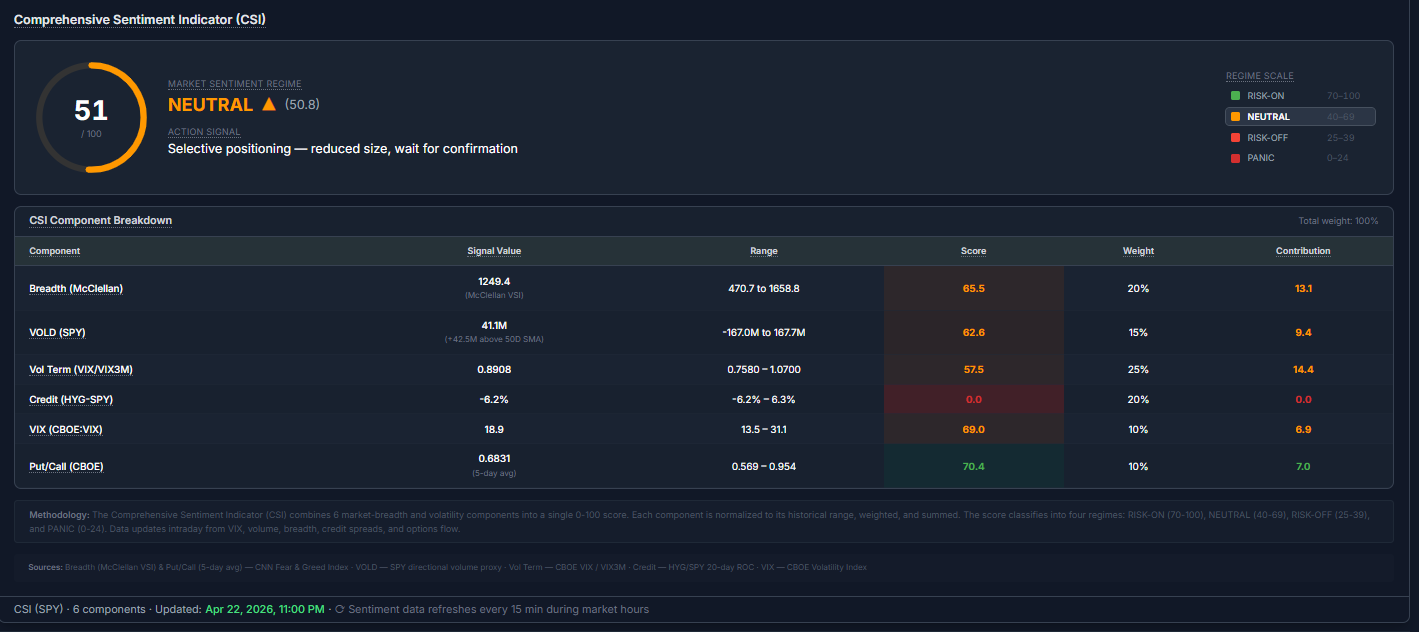 Market Sentiment — tracks options-market positioning and breadth signals across the US universe. Extreme fear can signal opportunity; extreme greed calls for tighter stops.