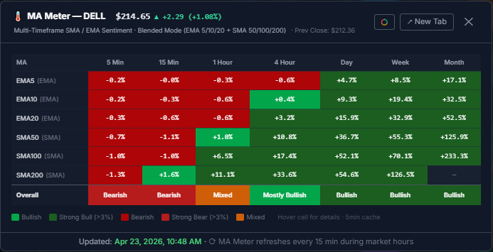 Major Indexes — a live snapshot of how the S&P 500, Nasdaq, Russell 2000, and Dow Jones are trending right now, each with a composite technical score. If the broad market is below its 200-day SMA and RSI is falling, you want to be more selective with everything below it.