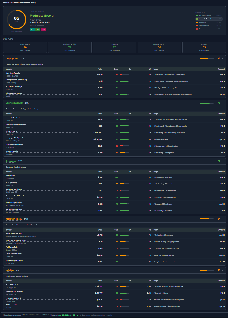 Rankings alone are noisy. A sector can be #1 in a falling market and still lose money. So the second layer is a macro economic regime model — the MEI (Macro Economic Indicator) — that classifies the environment as risk-on, balanced, or defensive based on yield curves, credit spreads, FRED data, and breadth.