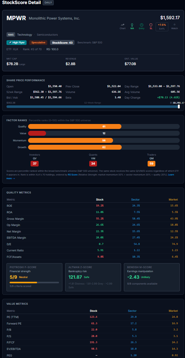 Once you've identified the leading sectors, the final step is picking the names inside them with the strongest confluence — momentum, trend, fundamentals, and analyst signal aligned. That's what the stockscore layer does. Sector rotation gets you in the right neighbourhood. Stock selection gets you the right house.